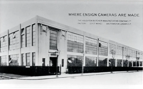 London-based glass merchants on High Holborn, Antoine Claudet (another frenchman) and George Houghton, diversified into this new industry when Claudet managed to obtain instructions and a license directly from Louis Daguerre to set up a studio while Houghton concentrated on photographic supplies. Claudet sped up exposure times with different chemicals to the relief of his sitters and even invented the safe darkroom ‘red light’. Claudet died in 1867 but Houghton’s son was already on board and by 1903 they’d expanded into the property next door and were now making their own-brand film called Ensign Daylight Loading photographic roll film. Incorporating other smaller camera makers trade was now so brisk for Houghton Ltd that they built a factory on Fulbourne Road in Walthamstow to fulfill demand, adding the Ensign brand to their range of cameras. Joining forces with cinematic camera and projector manufacturer W Butcher staffing levels reached over 700, making it Britain’s (or as the publicity boasted the Empire’s) biggest camera factory. The original 1920 building was designed by the aforementioned Wallis, Gilbert & Partners and was 280 ft wide and 75 ft deep. Constructed of reinforced concrete and featuring small-paned metal windows with brick spandrels, it was built initially as a single storey with four first floor offices, but later an entire first floor was added to increase production space. Even though the High Holborn headquarters were destroyed by bombing during WW2 the factory played its part in the war effort producing items for the armed forces. Sadly after the war demand had waned and despite various mergers, foreign imports finally took their toll and Ensign production moved to Clapham Common in 1955. It was the end of an era.